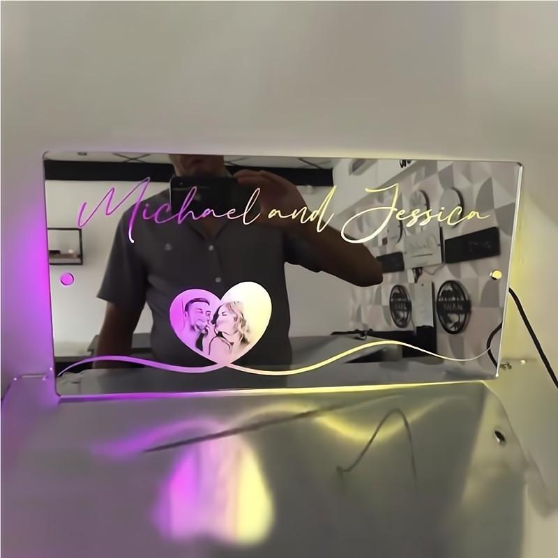 Questa splendida insegna a specchio personalizzata con illuminazione a LED multicolore è l'aggiunta perfetta a qualsiasi camera da letto.