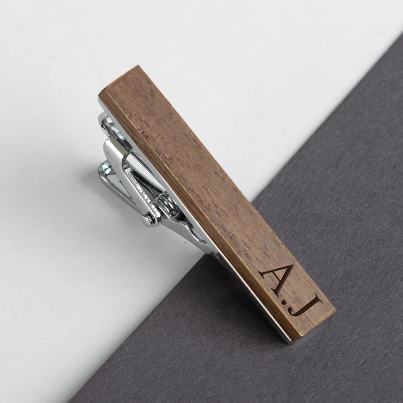 Fermacravatta in legno inciso con le tue iniziali per il giorno del tuo matrimonio speciale, compleanno o qualsiasi occasione.